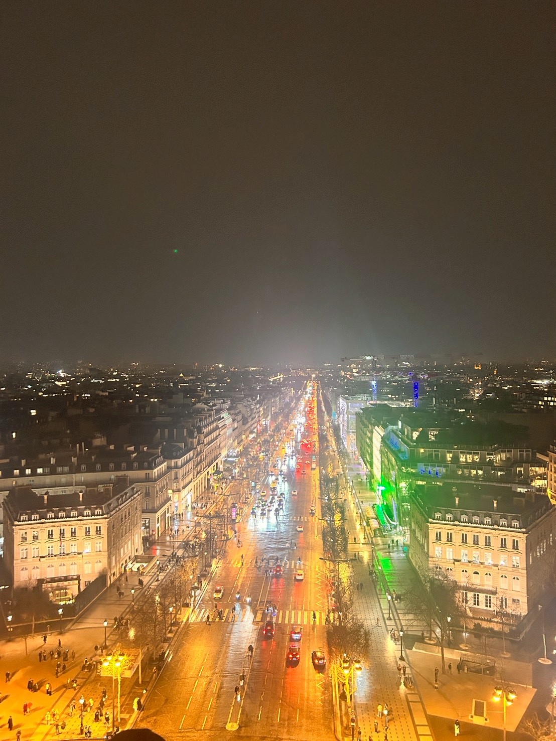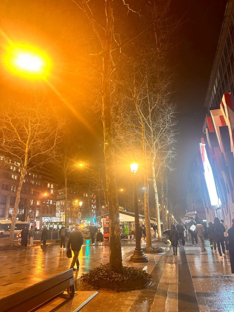 夜は少し雨が降ってきて、シャンゼリゼ通りの夜景が濡れた石畳に反射して、