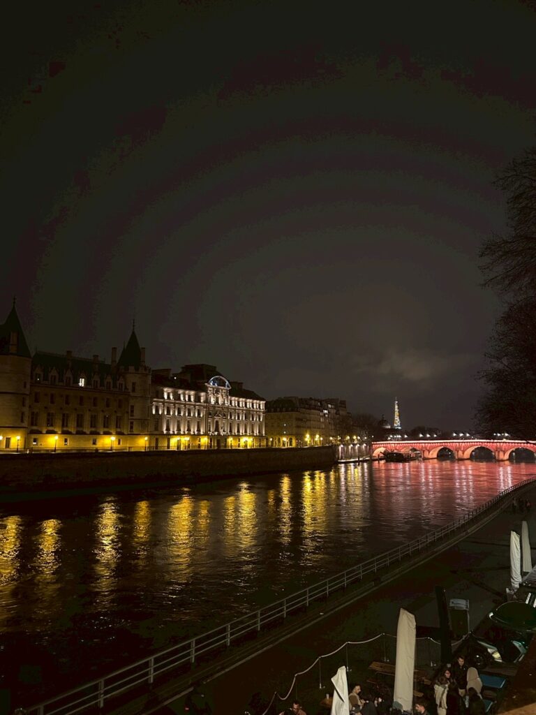 セーヌ川がライトアップされてました。遠くにエッフェル塔も見えて、とても綺麗でした。