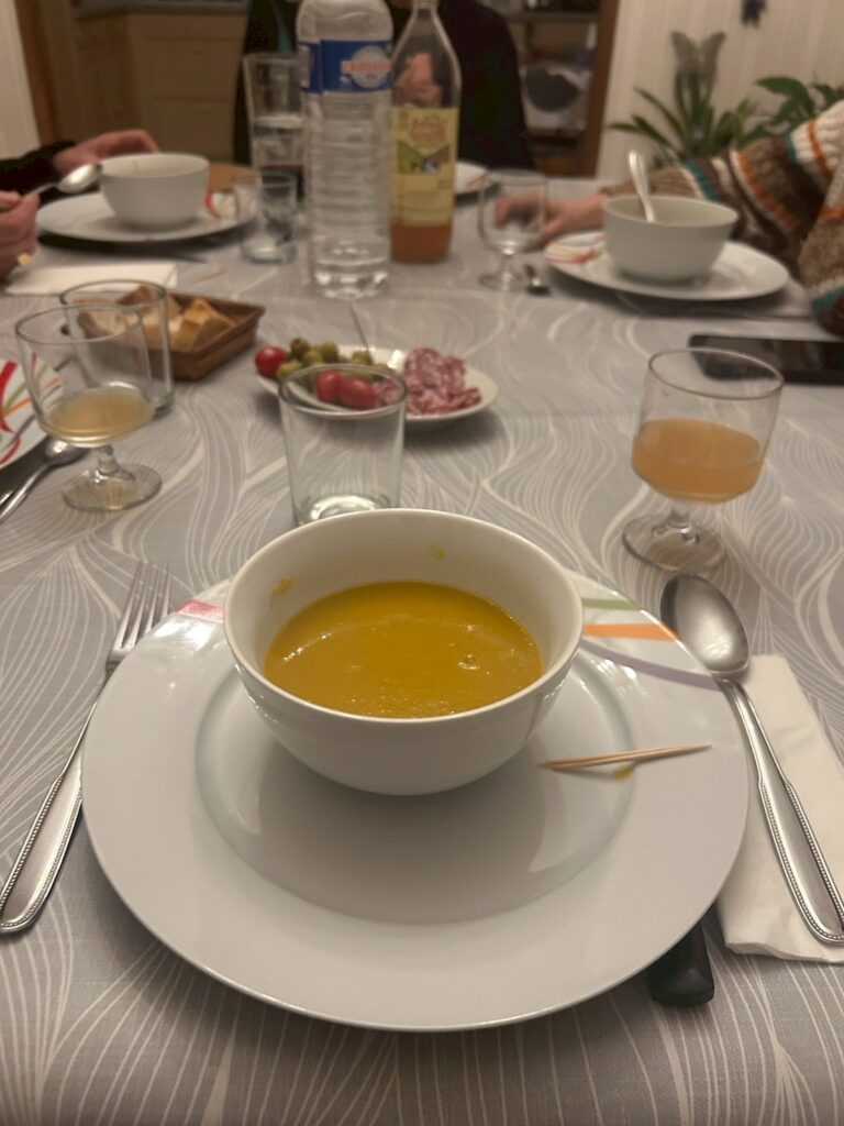 最初にサラミやオリーブを楽しみ、次にスープが出てきました。